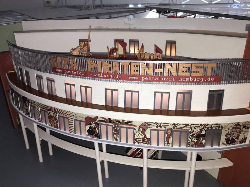 Die Kita Piraten-Nest ist zu einem wichtigen Teil des Millerntor-Stadions geworden – das gilt natürlich auch für das Modell des Stadions, das von Stadionmodellbau Tribian gebaut wird (wir berichteten bereits im Januar). Der Baufortschritt im frühen Frühjahr hat in besonderem Maße auch die Kita selbst betroffen – es gibt jetzt den Dachspielgarten mit Zaun und Piraten-Nest-Schriftzug, die Fassade mit viel Details, und sogar eine Innenbeleuchtung.