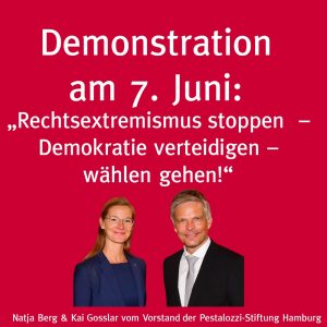 Am Sonntag sind die Europawahlen und in Hamburg und acht anderen Bundesländern gleichzeitig die Kommunal(bzw. Bezirks)wahlen. An diesem Freitag ruft das „Bündnis der Bündnisse“ aus Gewerkschaft, Zivilgesellschaft, Umweltschutz, Kirche/Diakonie, Wirtschaft … zu einer Kundgebung und Demonstration auf mit dem Motto: „Rechtsextremismus stoppen – Demokratie verteidigen – wählen gehen“.