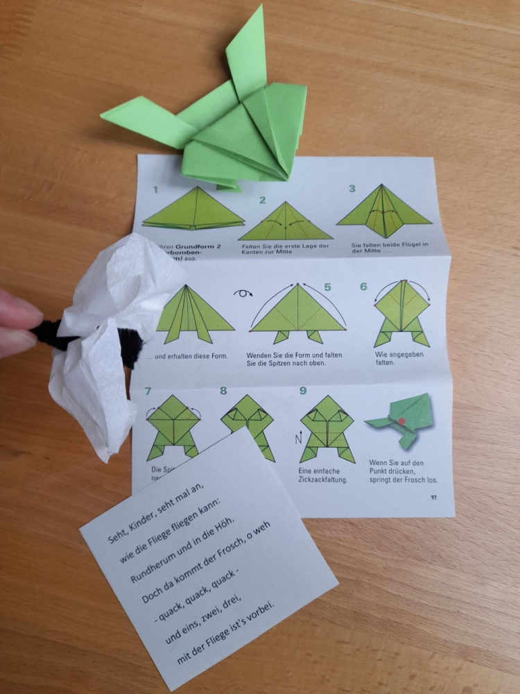 Gebastelt wurde ein Geschichtensäckchen mit einer Fliege und einem Frosch. Wir erfuhren: Der Begriff Geschichtensäckchen hat sich gebildet aus dem schwedischen Wort Sagopasen=Märchentüte. Diese kleinen Säckchen mit Symbolen aus einer Geschichte bieten eine passende Möglichkeit dialogisch vorzulesen, um Sprache und Phantasie anzuregen und den Wortschatz zu erweitern.