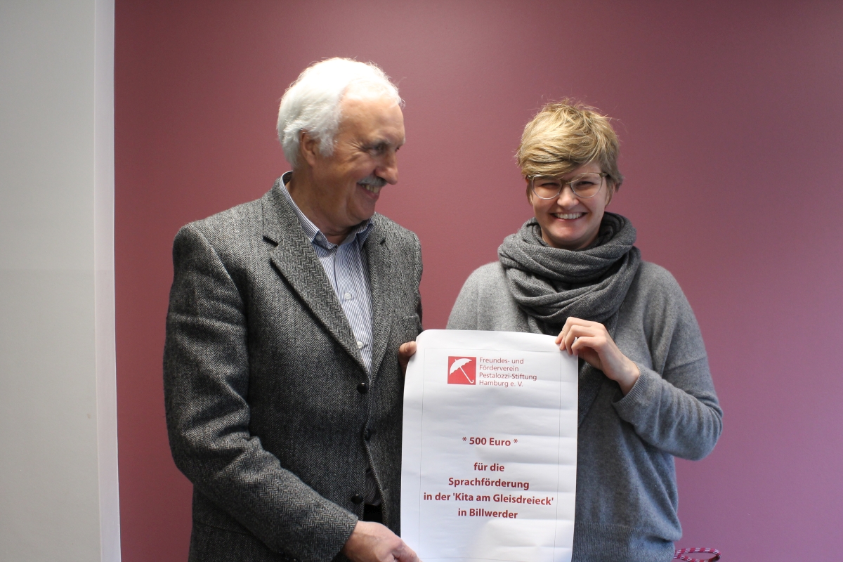In unserer Kita in Billwerder werden Kinder aus Flüchtlingsfamilien betreut, für deren Integration die Sprachförderung von besonderer Bedeutung ist. Dafür sind Bücher sehr hilfreich und der “Freundes- und Förderverein der Pestalozzi-Stiftung Hamburg” konnte mit einer Förderung weiterhelfen. Eine ehemalige Kollegin besorgte einen Bücherkoffer und arbeitet nun einmal in der Woche mit den Kindern. Diese sind eifrig dabei und haben schon enorme sprachliche Fortschritte gemacht, sodass in der Zwischenzeit parallel auch Mitgliedschaften in der Bücherhalle organisiert wurden. Gestern, am 5. März, erfolgte die offizielle Spendenübergabe durch den stellvertretenden Vorsitzenden des Vereins, Dr. Arthur Friedrich. Andrea Schütte, die Leiterin der Kita, bedankte sich herzlich!