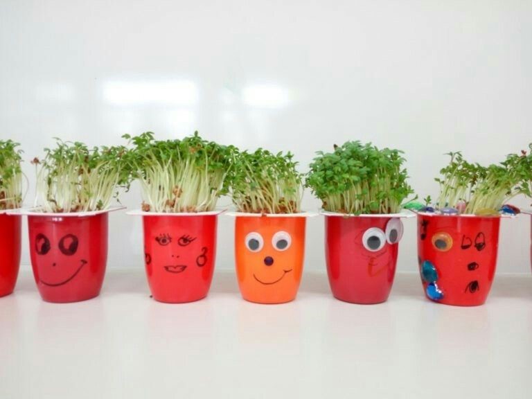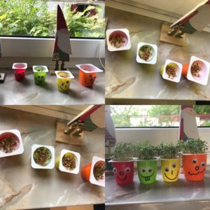 - Wenn du möchtest, kannst du auf die Becher Gesichter malen, dann wachsen ihnen grüne Strubbel- Frisuren 😊