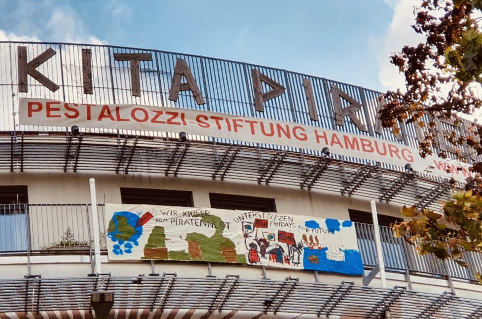 Die Kinder der Kita Piraten-Nest unterstützen (gut sichtbar für den Stadtteil St. Pauli) Fridays for Future!