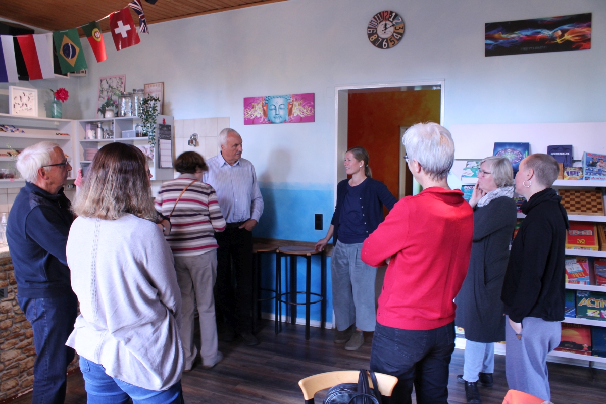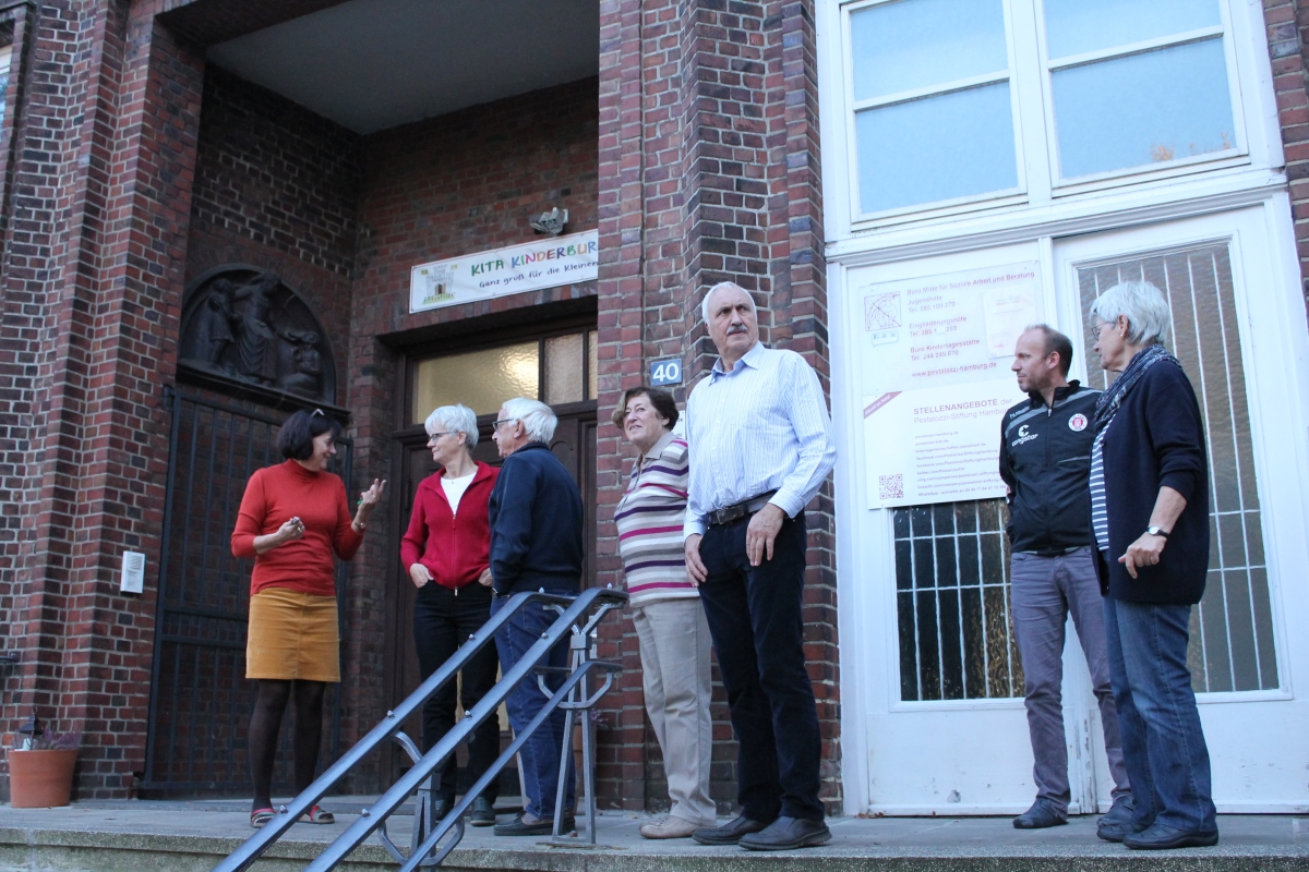 Weiter ging es bei schönem Herbstwetter nach Bergedorf-West. Hier haben wir seit Jahren zwei auf den Stadtteil orientierte soziale Angebote im Haus der Jugend Heckkaten, dem „Pink-Haus“. Die Angebote erläuterten ihre Arbeit und die Herausforderungen anschaulich und doch eingehend, die Besucher waren sehr beeindruckt.